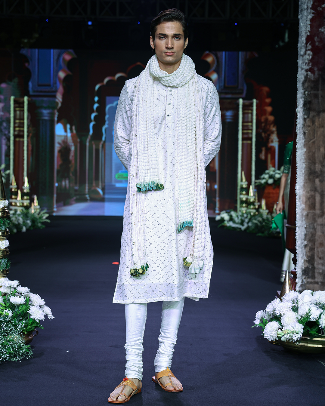 Flowing raw silk kurta featuring sequins and Zardosi work on the yoke, highlighted with delicate sequins motifs all over. Paired with a handloom kora Chandheri dupatta adorned with zardosi work…