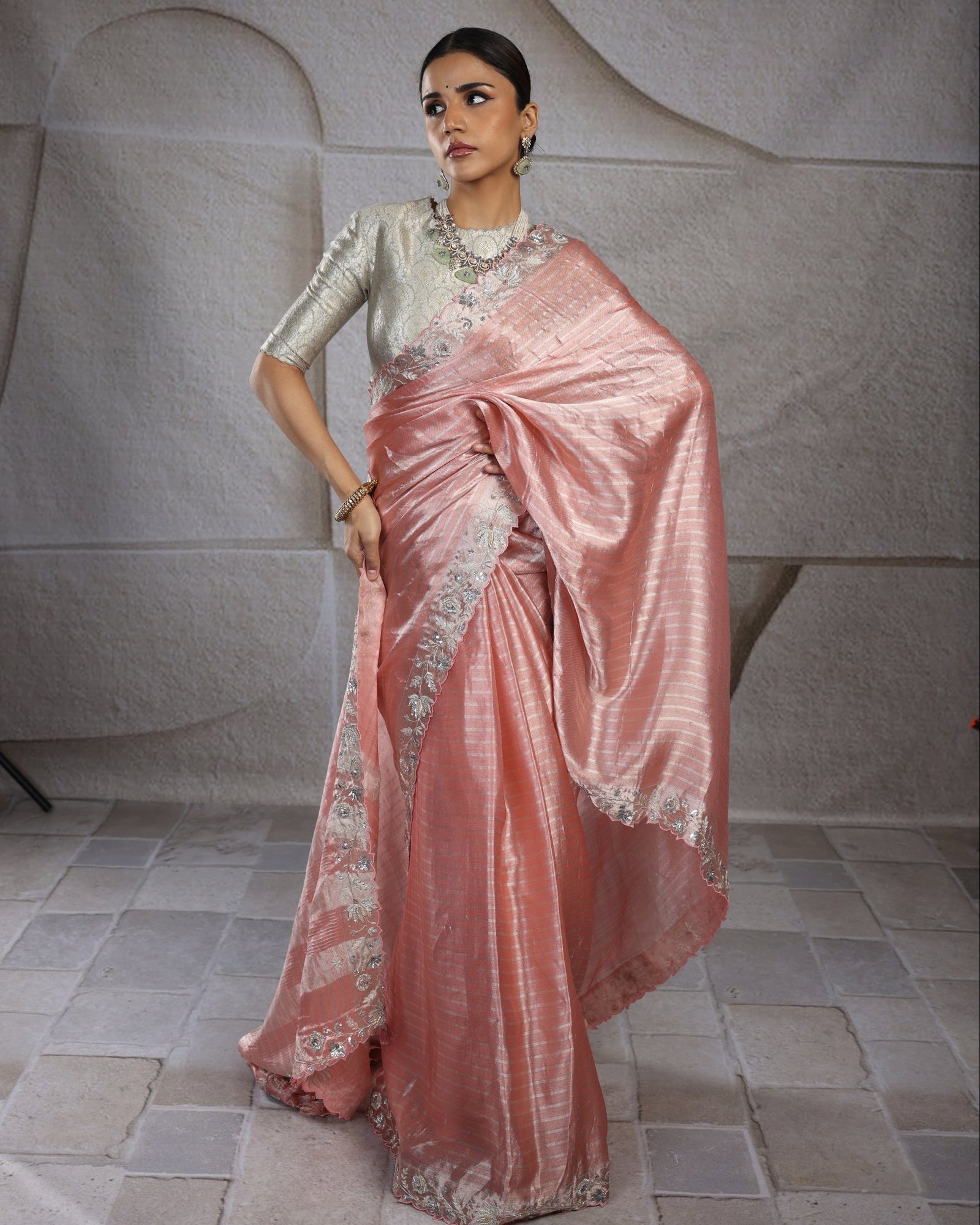 A Stunning Chanderi saree adorned with exquisite zardozi detailing along the border, flawlessly paired with an opulent brocade blouse.
