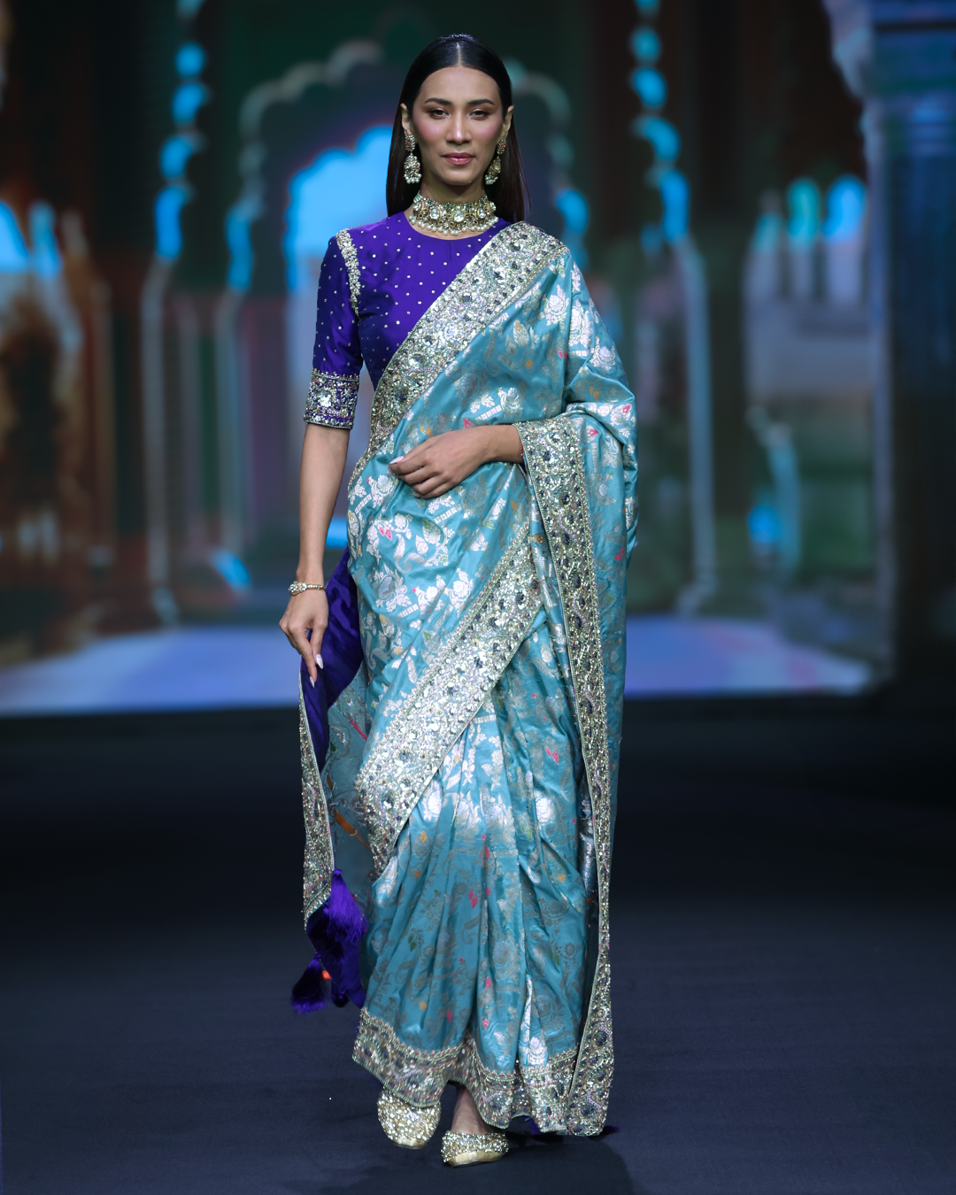 An exquisite Katan Banaras saree featuring an intricately hand-embroidered Zardosi work border with refined back finishing, paired with intricate work done silk blouse piece .
