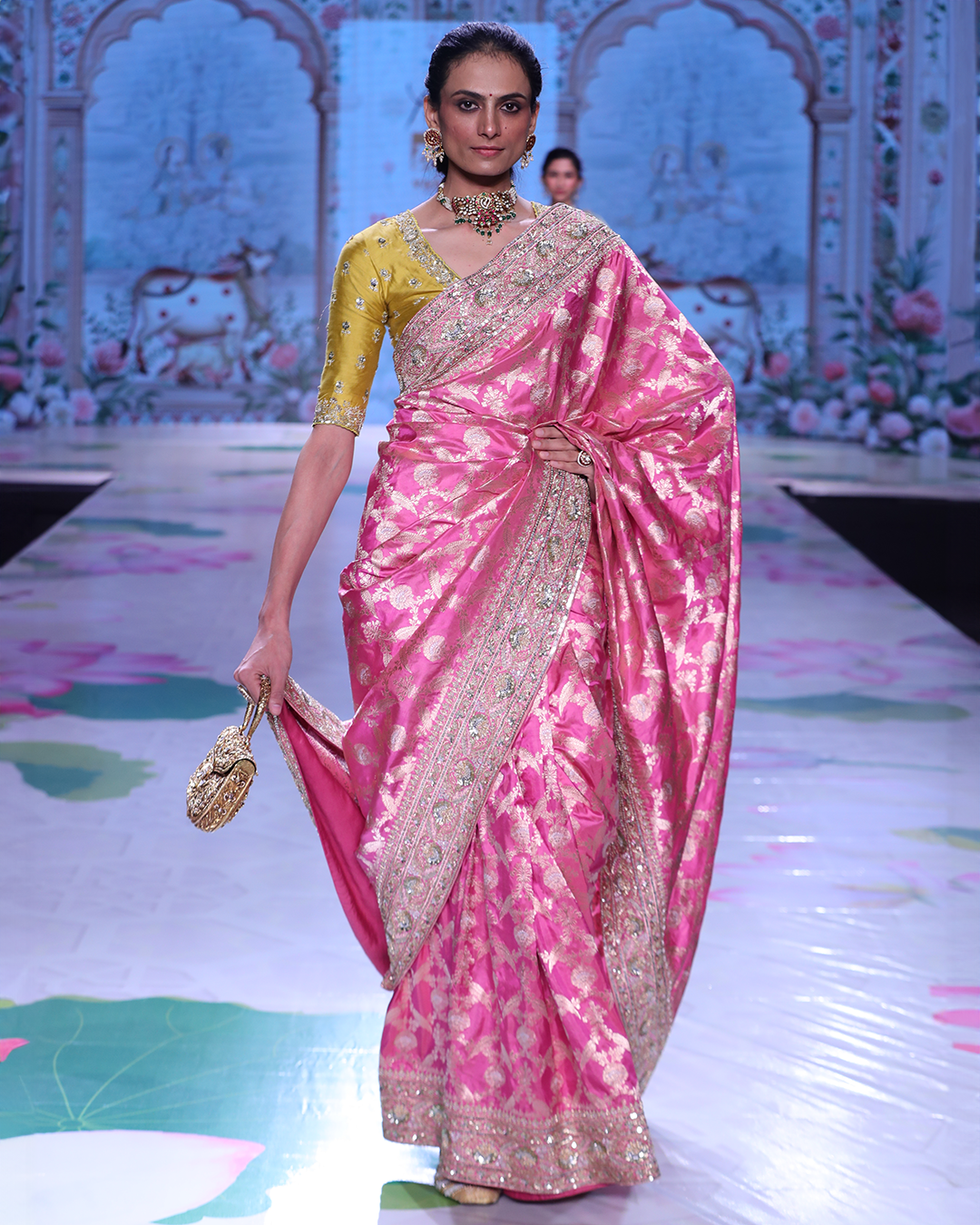 An exquisite Katan Benaras saree featuring an intricately hand-embroidered Zardosi work border with refined back finishing, paired with intricate work done munga silk blouse piece .