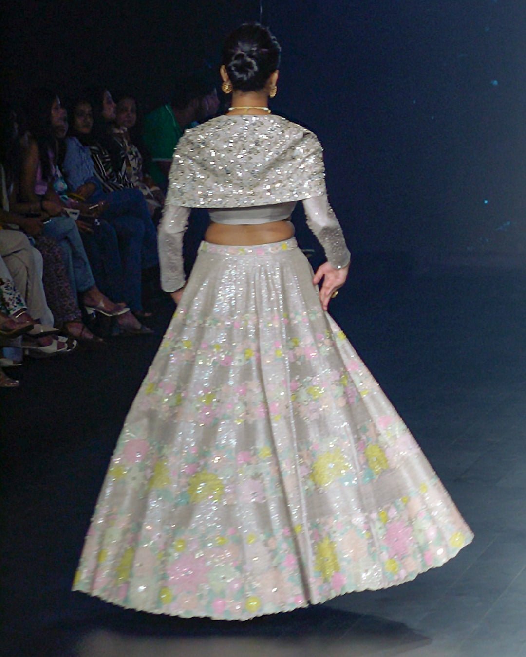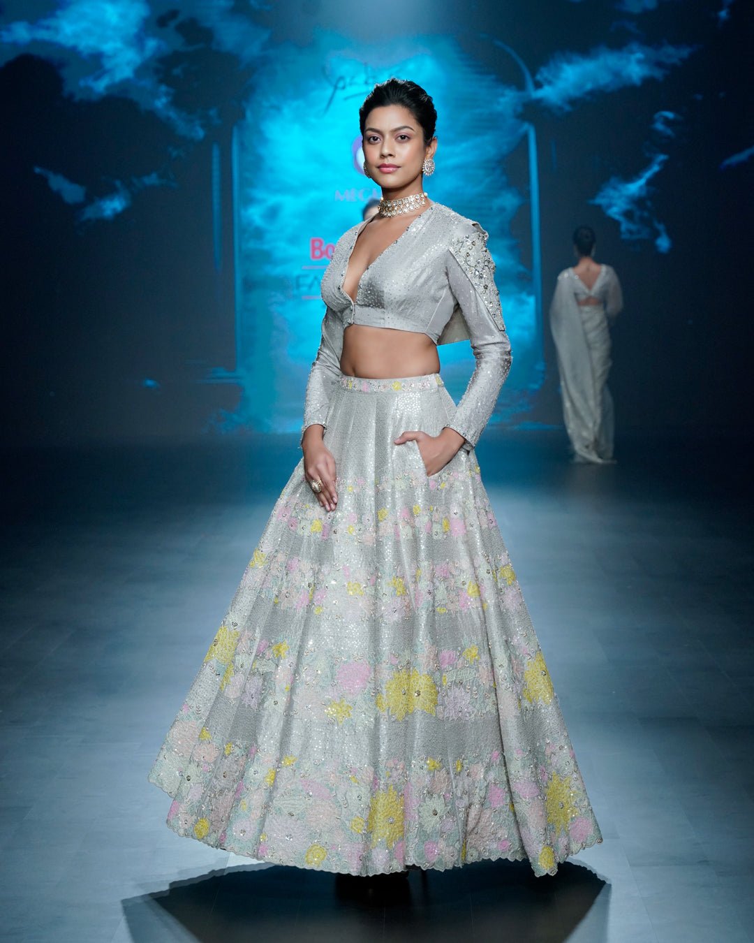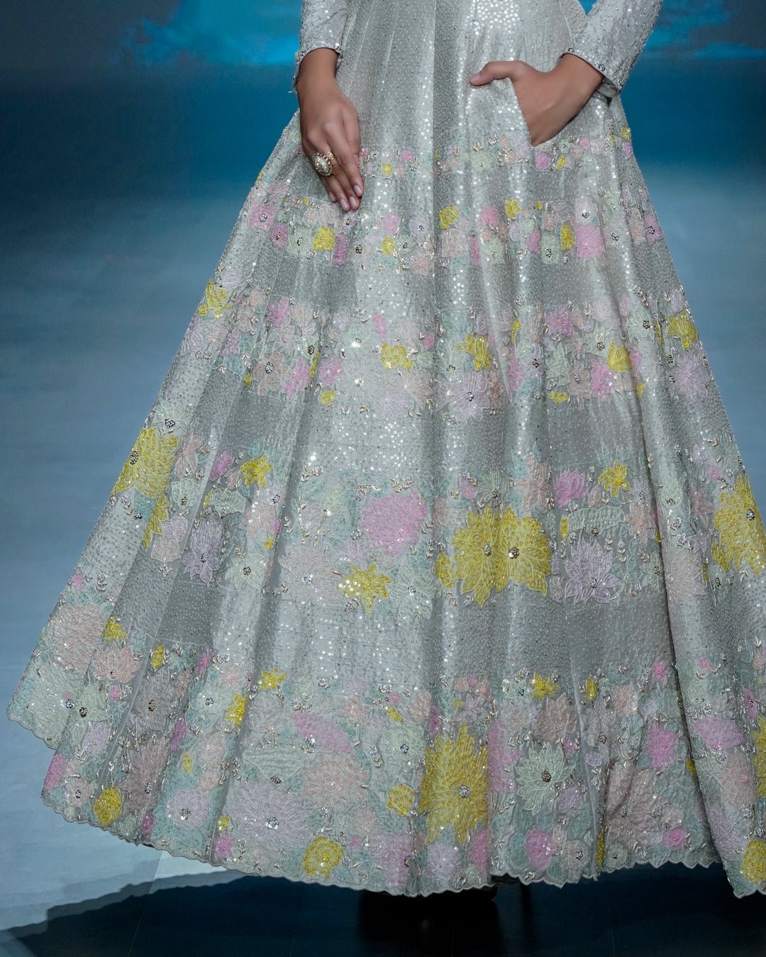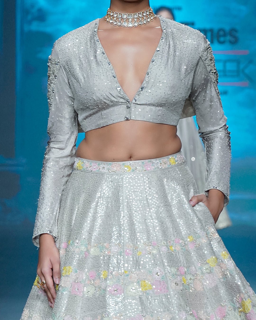 Blue falling raw silk lehenga with detailed golden and silver floral appliqué and zardozi work, paired with a sequin-adorned crop top. Lehenga: Falling Rawsilk Crop top: Falling Rawsilk