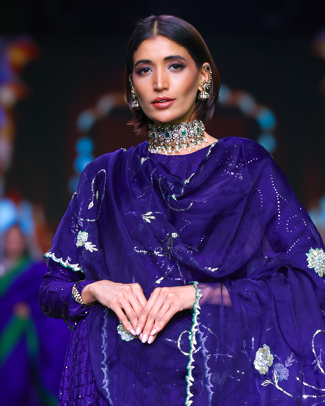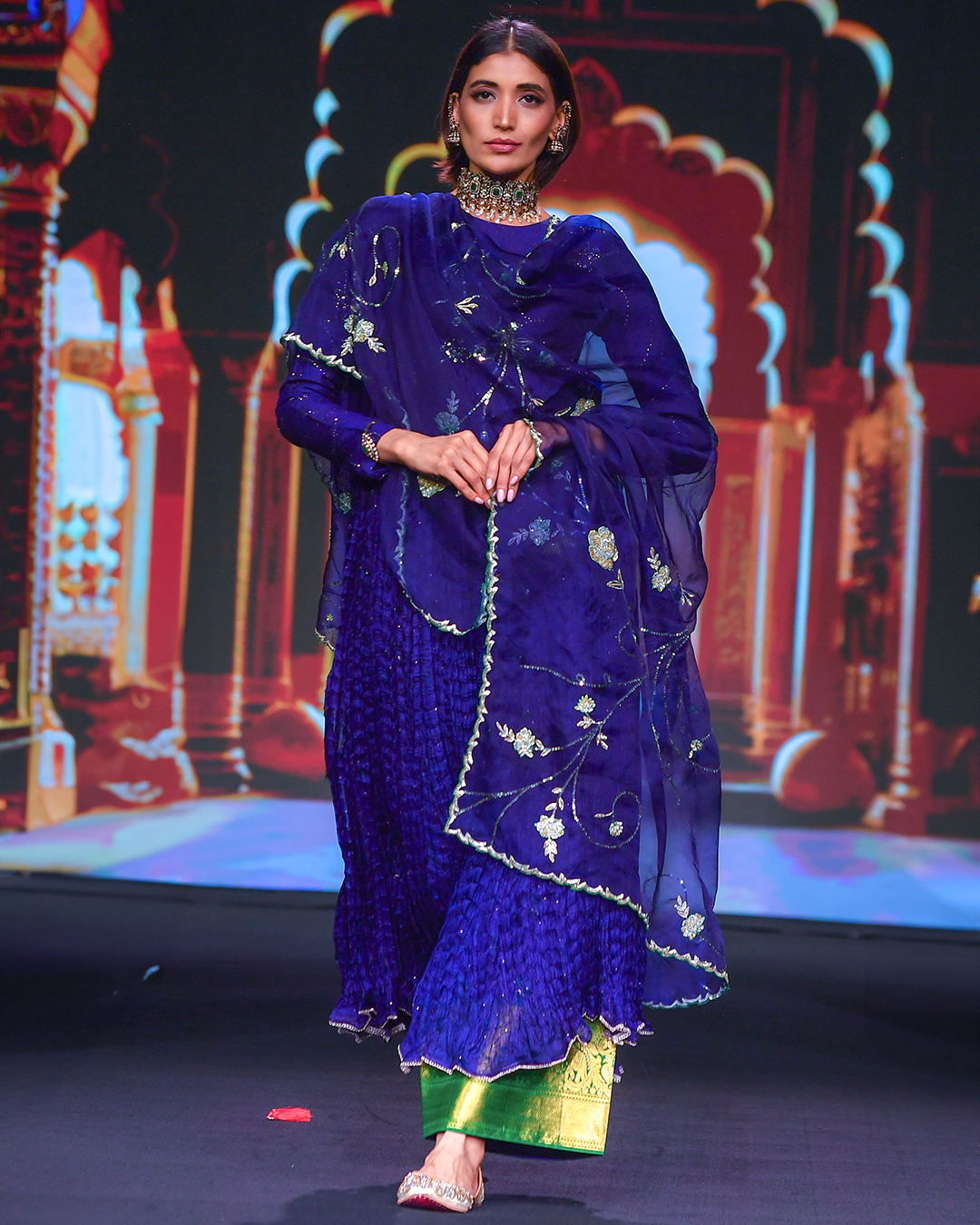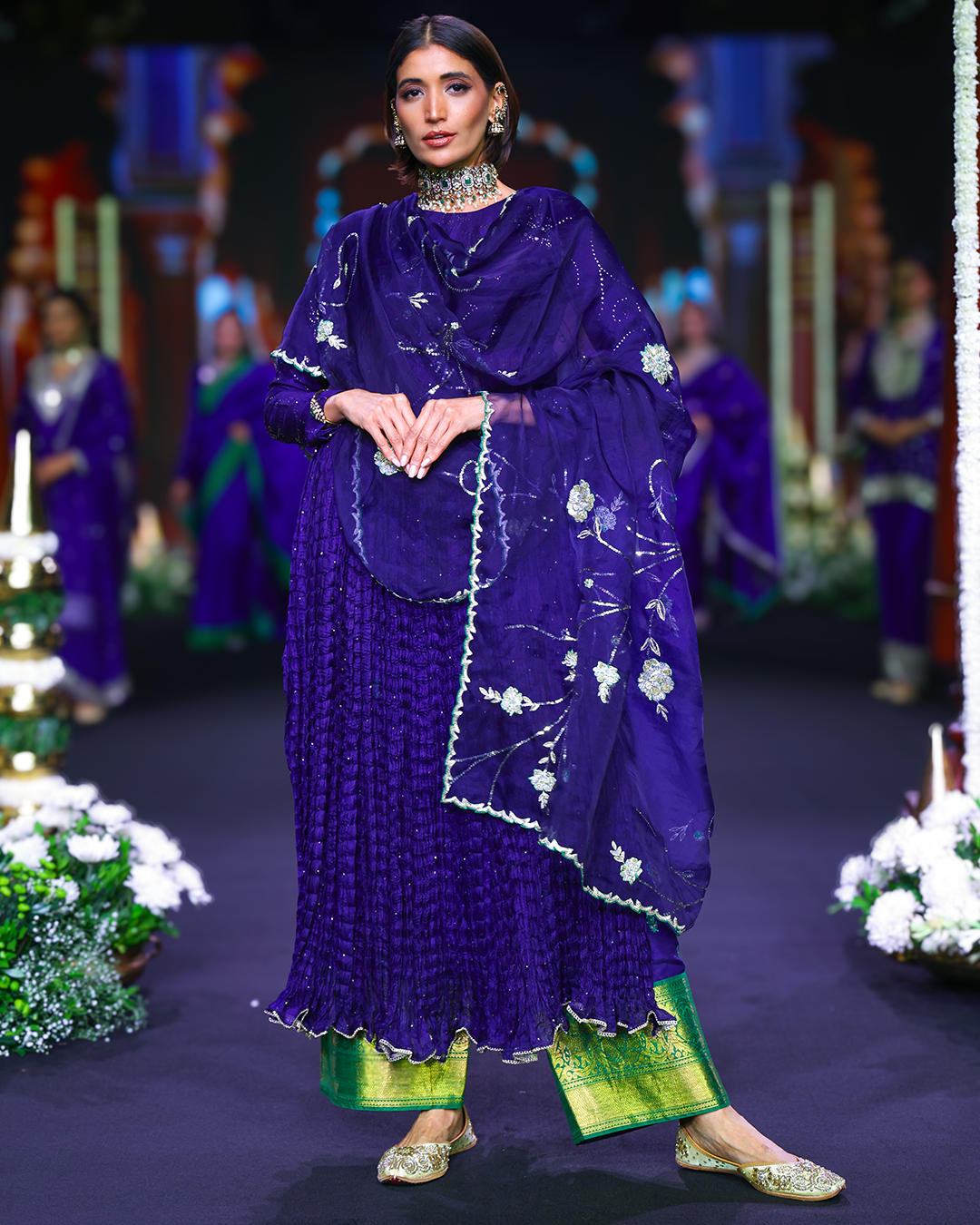 Exquisite Muga silk bodice enriched with intricate all-over mukaish work, continued with a crushed silk Kota detailed with Kamdani dots and elegant side slits from the waistline, paired with a flowing raw silk palazzo accented by a Kanjivaram border, and a silk organza dupatta adorned with fine sequins and zardosi craftsmanship.