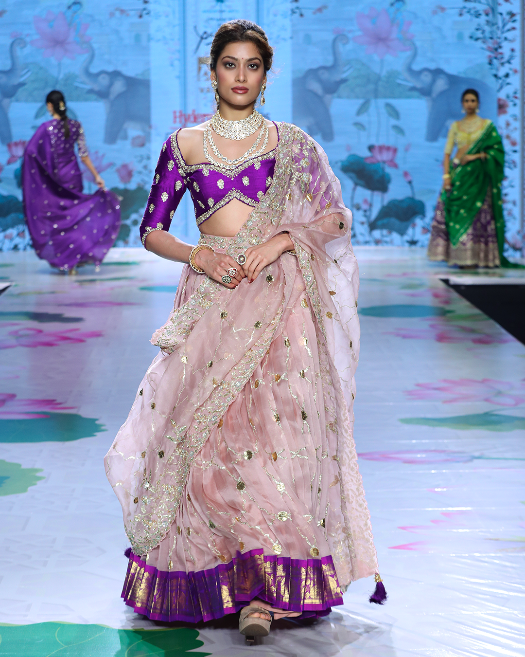 In an elegant realm, a falling raw silk lehenga, adorned with intricate appliqué and zardozi, complements its blouse. An organza dupatta, an appliqué canvas, drapes like a bow, evoking pure…