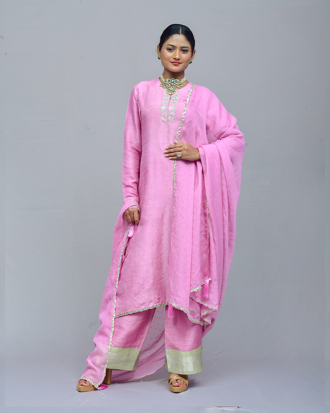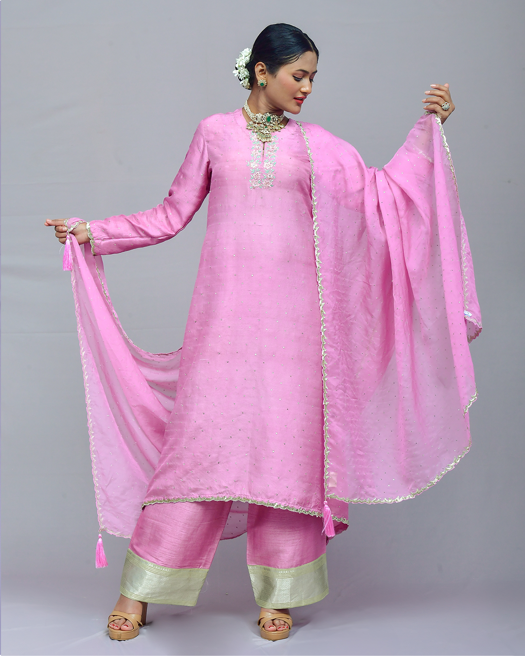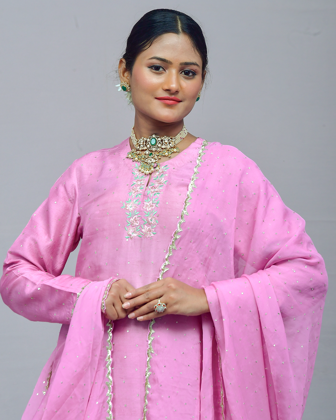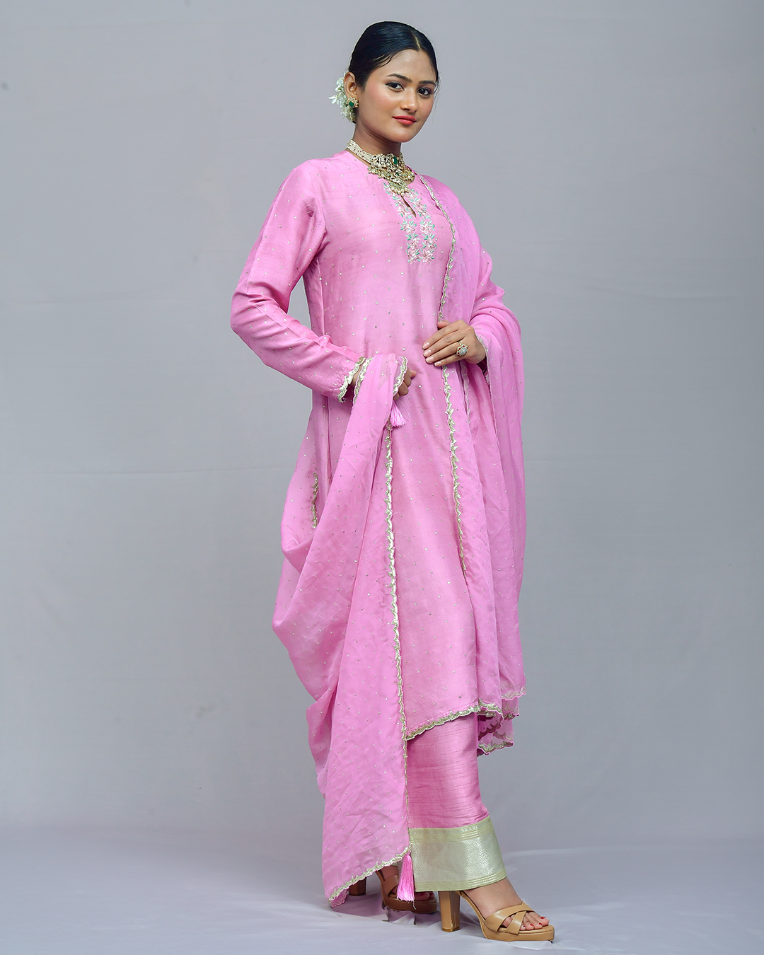 The elongated silhouette is embellished with intricate appliqué and zardozi work, accompanied by a knife-pleated organza lehenga and a crop top with a stylish shawl collar. Anarkali   : Falling Rawsilk Lehanga.…