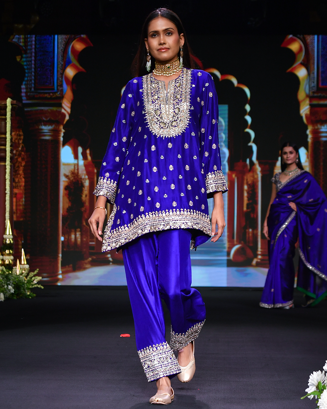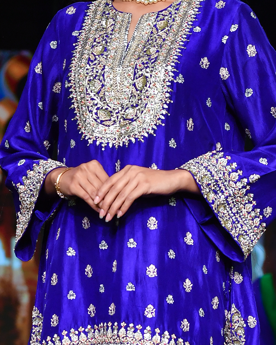 Elegant flowing raw silk short kurta set paired with a coordinated bottom, adorned with intricate craftsmanship across the yoke, kurta edges, sleeves, and the hemline of the bottom.
