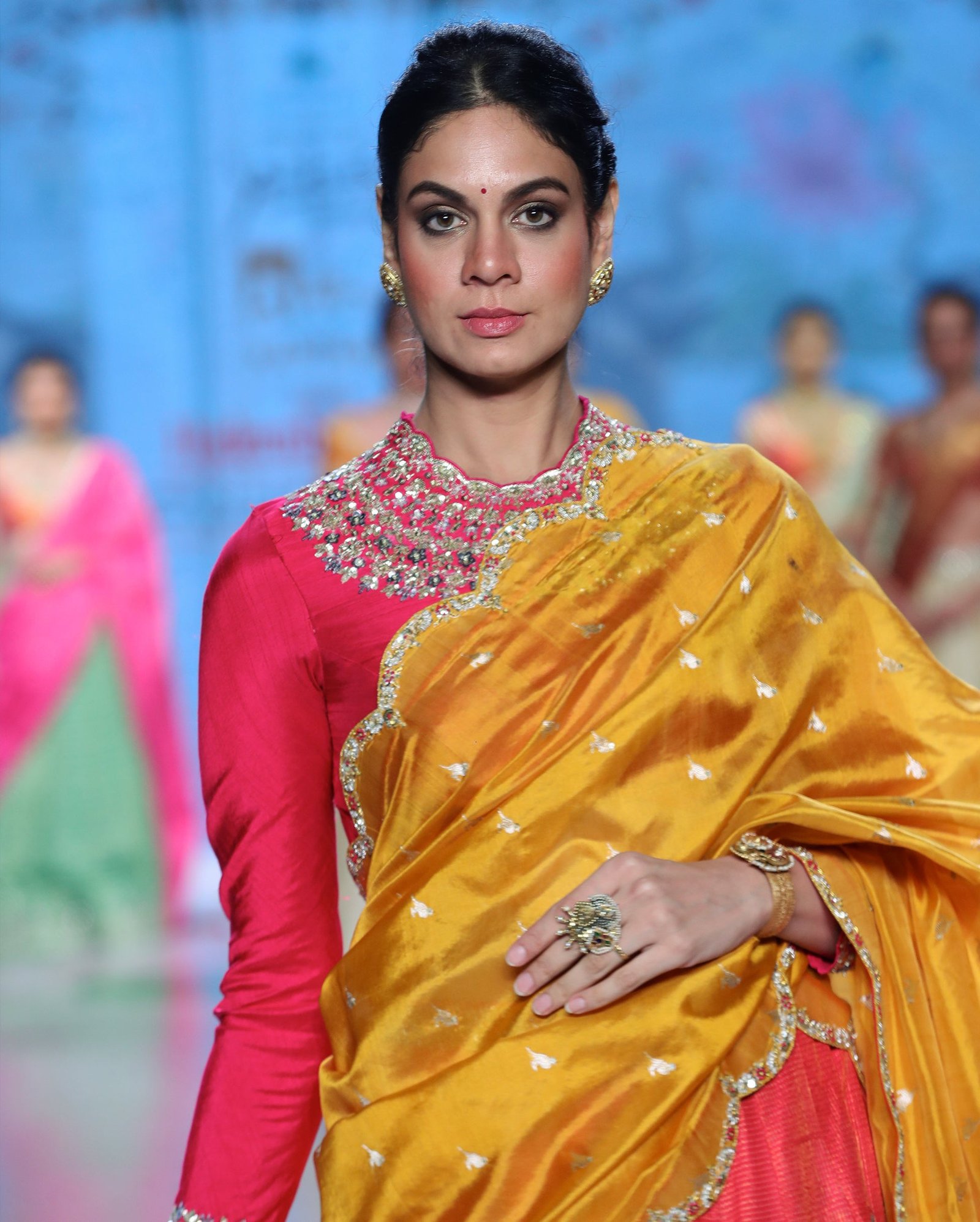 Tissue raw silk lehenga adorned with intricate Zardosi paisley motifs and a finely crafted Zardosi border, highlighted with delicate Kamdani dots scattered all over and detailed waist belt work. Paired…