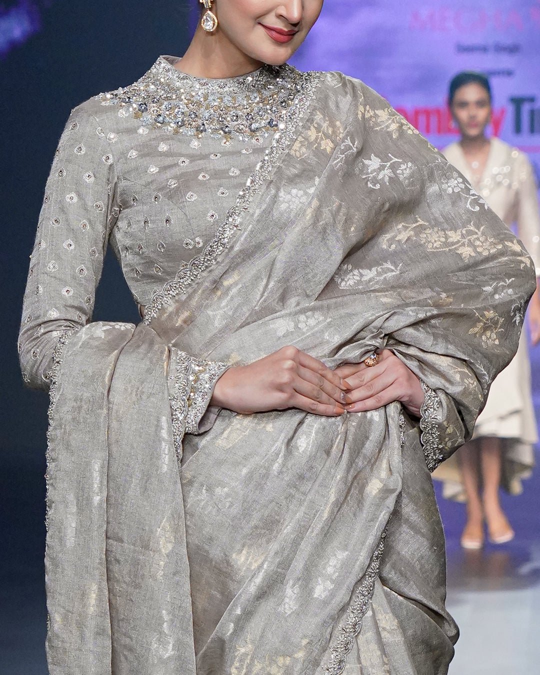 In an elegant realm, a falling raw silk lehenga, adorned with intricate appliqué and zardozi, complements its blouse. An organza dupatta, an appliqué canvas, drapes like a bow, evoking pure…
