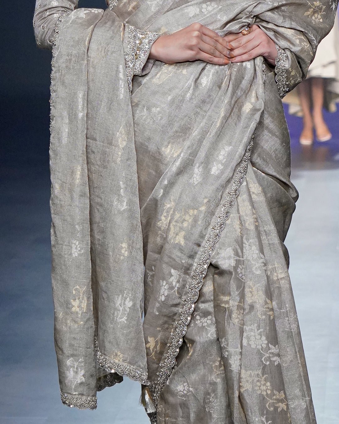 A Stunning Chanderi saree adorned with exquisite zardozi detailing along the border, flawlessly paired with an opulent brocade blouse. Saree     :  Chanderi Blouse   :  Brocade Blouse
