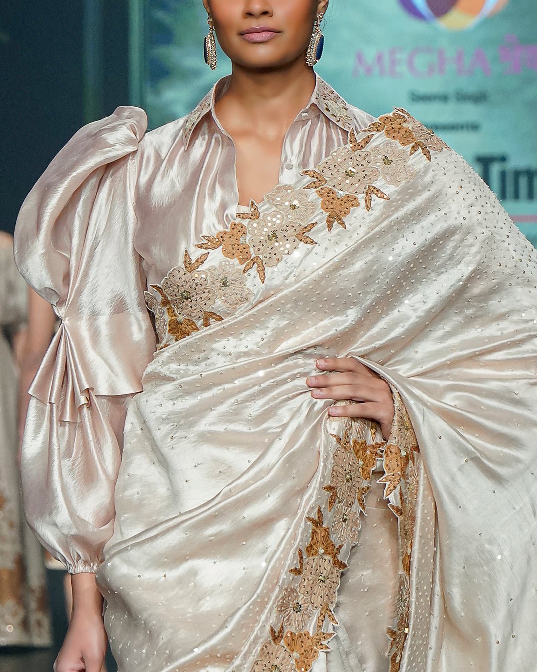 A Chanderi sico saree is embellished with zardozi work along the border and is paired with a blouse featuring balloon sleeves. Saree: Chanderi Sico Blouse: Falling Rawsilk