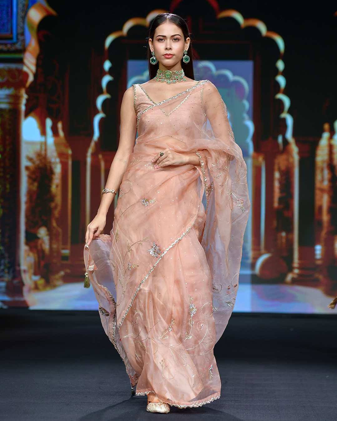 Elegant silk organza saree featuring sequins and intricate zardosi detailing all over the saree , paired with a raw silk blouse piece for a refined finish.