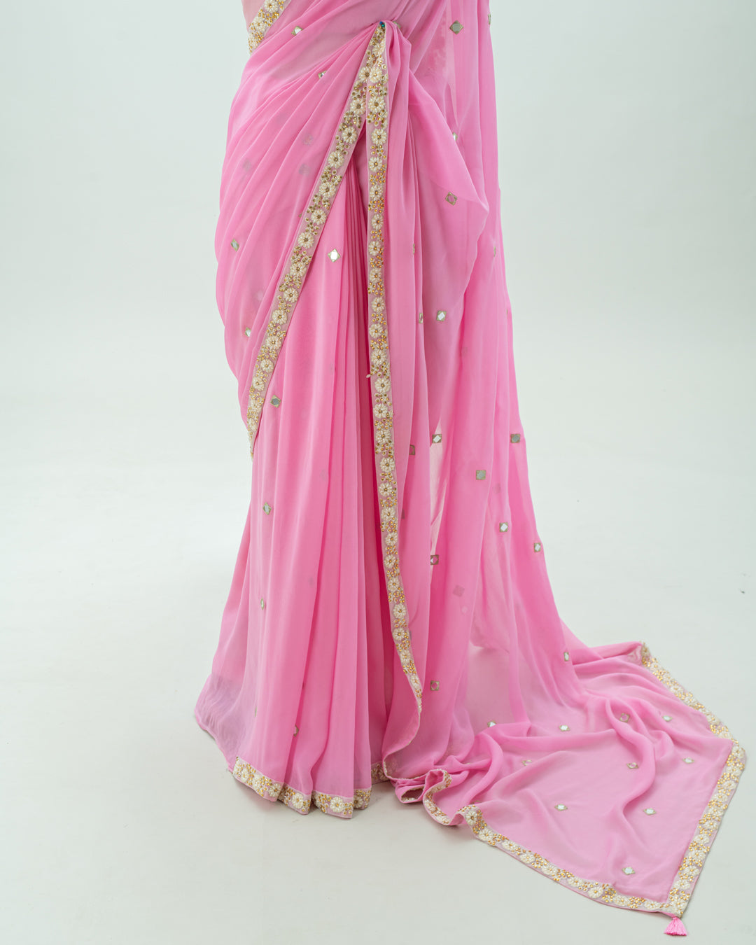 Crafted in soft pink georgette, this saree presents a masterfully executed design where the pallu and drape are embellished with dimensional pearl work and intricate white floral threadwork, creating sophisticated textural depth. Strategic mirror placement across the body provides luminous detailing that enhances movement and visual interest.